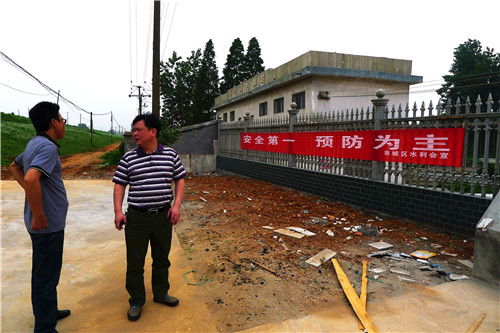 圖為市水利局長(zhǎng)胡經(jīng)緯、分管安全生產(chǎn)的副局長(zhǎng)涂鴻雁及相關(guān)人員在觀看安全生產(chǎn)宣傳板報(bào)和工作督查