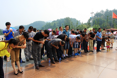 面向毛主席銅像深情鞠躬